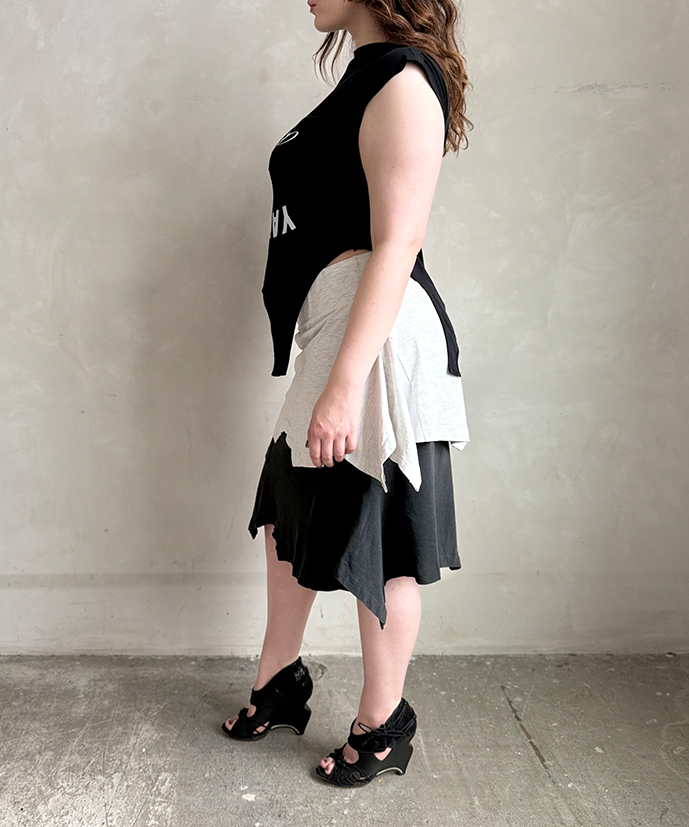 The 180 Vest: a unique and flattering silhouette made from a reworked secondhand vest. It's comfortable and versatile in your wardrobe. It has a high neck, and cuts high on the side of the waist. The straps of the vest create curved shapes at the front and back. This black top features white Yankees lettering print on the front.