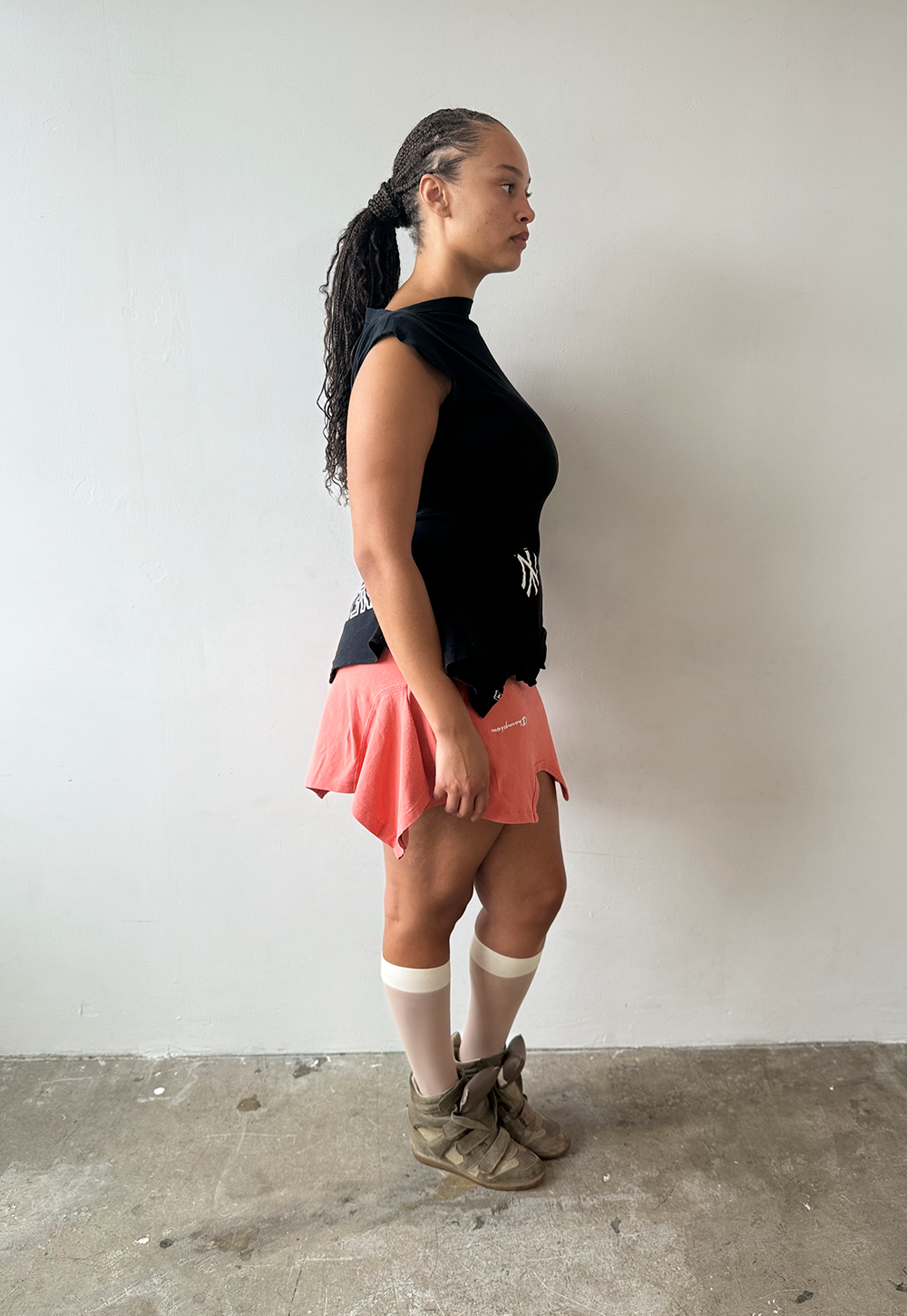 The 180 Top: a unique and flattering silhouette made from a reworked secondhand t-shirt. It's comfortable and versatile in your wardrobe. It has a high neck, and the shaping around the waist and the upside-down sleeves create a waterfall hem detail on the sides. This black top features a white NY printed graphic on the front and New York lettering on the back.
