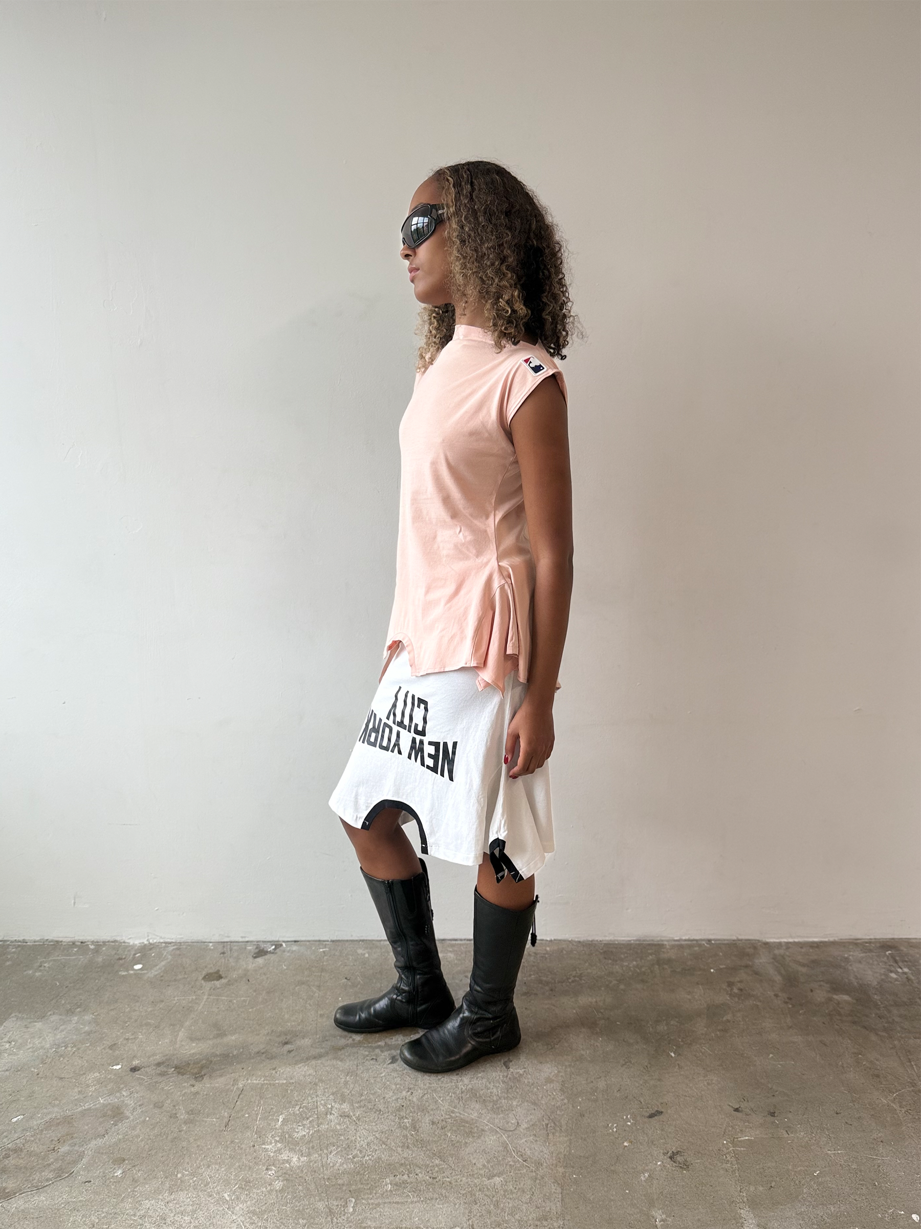 The 180 Top: a unique and flattering silhouette made from a reworked secondhand t-shirt. It's comfortable and versatile in your wardrobe. It has a high neck, and the shaping around the waist and the upside-down sleeves create a waterfall hem detail on the sides. This blush pink top features a pink NY printed graphic on the front and back.