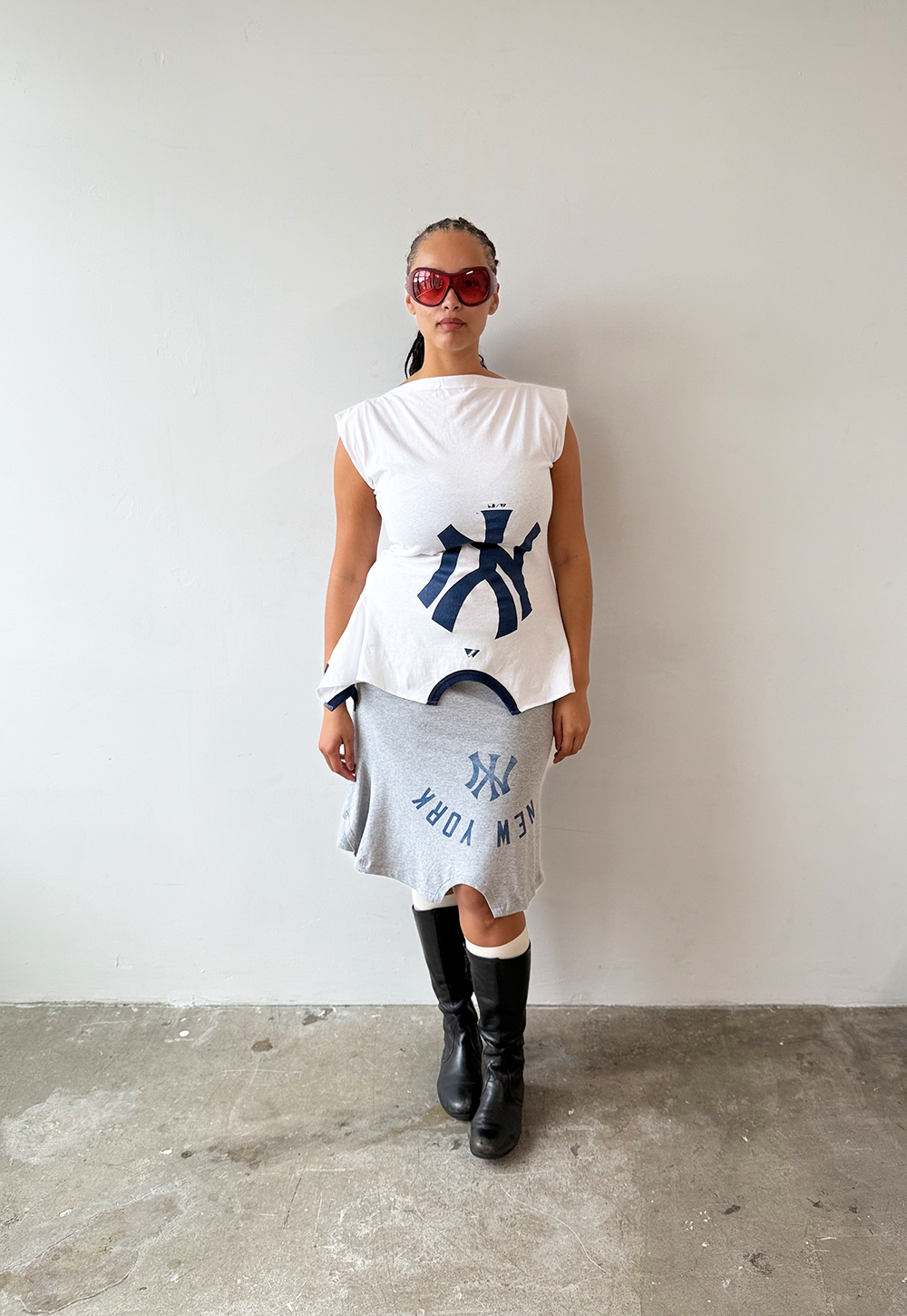 Grey printed mid-length skirt made from reworked vintage t-shirt material, with wide elastic waist for a comfortable low rise fit. Features navy NY New York printed lettering. Can also be worn as a long top/ dress.