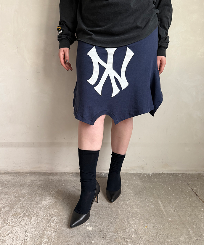 Navy mid-length skirt made from reworked secondhand t-shirt material, with wide elastic waist for a comfortable low rise fit. Can also be worn as a top. Features white printed NY on the front.